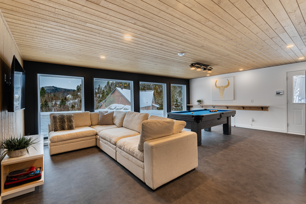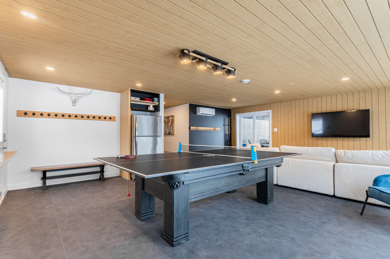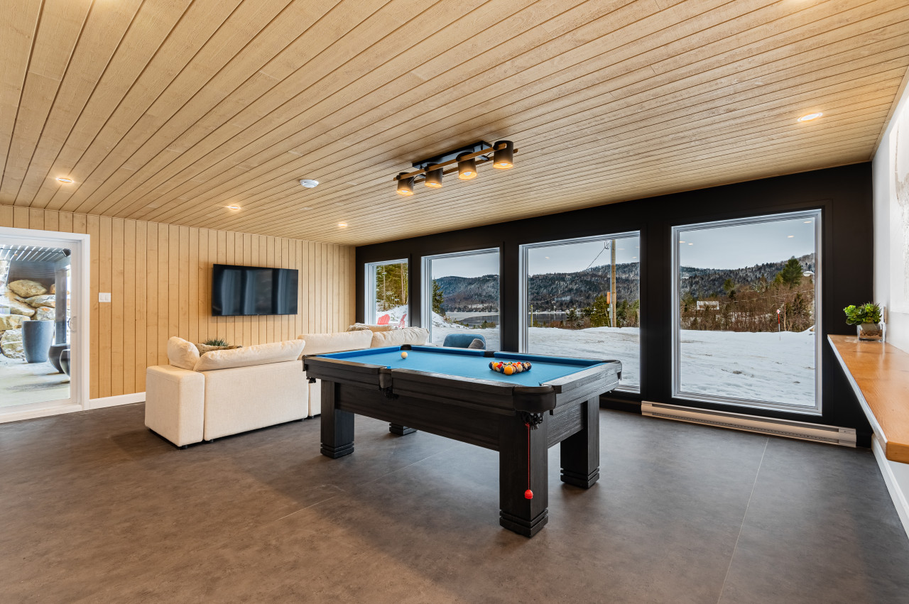 Détendez-vous dans la piscine intérieure chauffée ou encore le spa extérieur couvert, tous deux accessibles à l’année. Un foyer extérieur est également à votre disposition à l’été pour animer vos soirées. De plus, vous retrouverez au deuxième salon une salle de jeux avec une table de billard, table de ping pong et jeux de société.