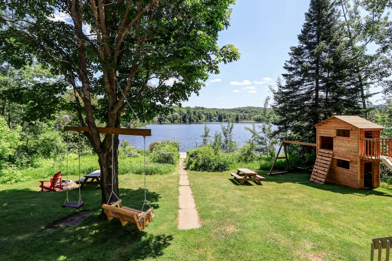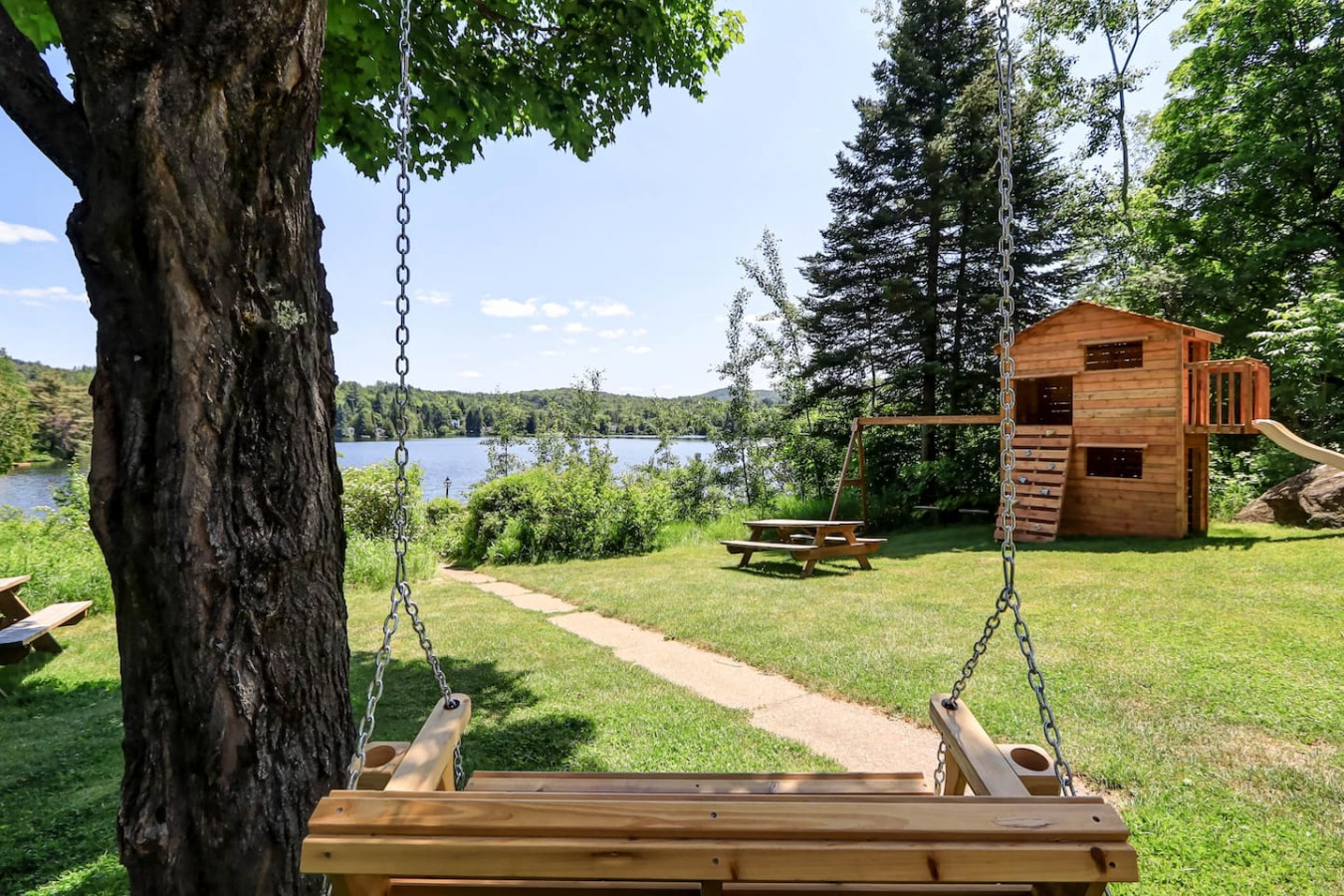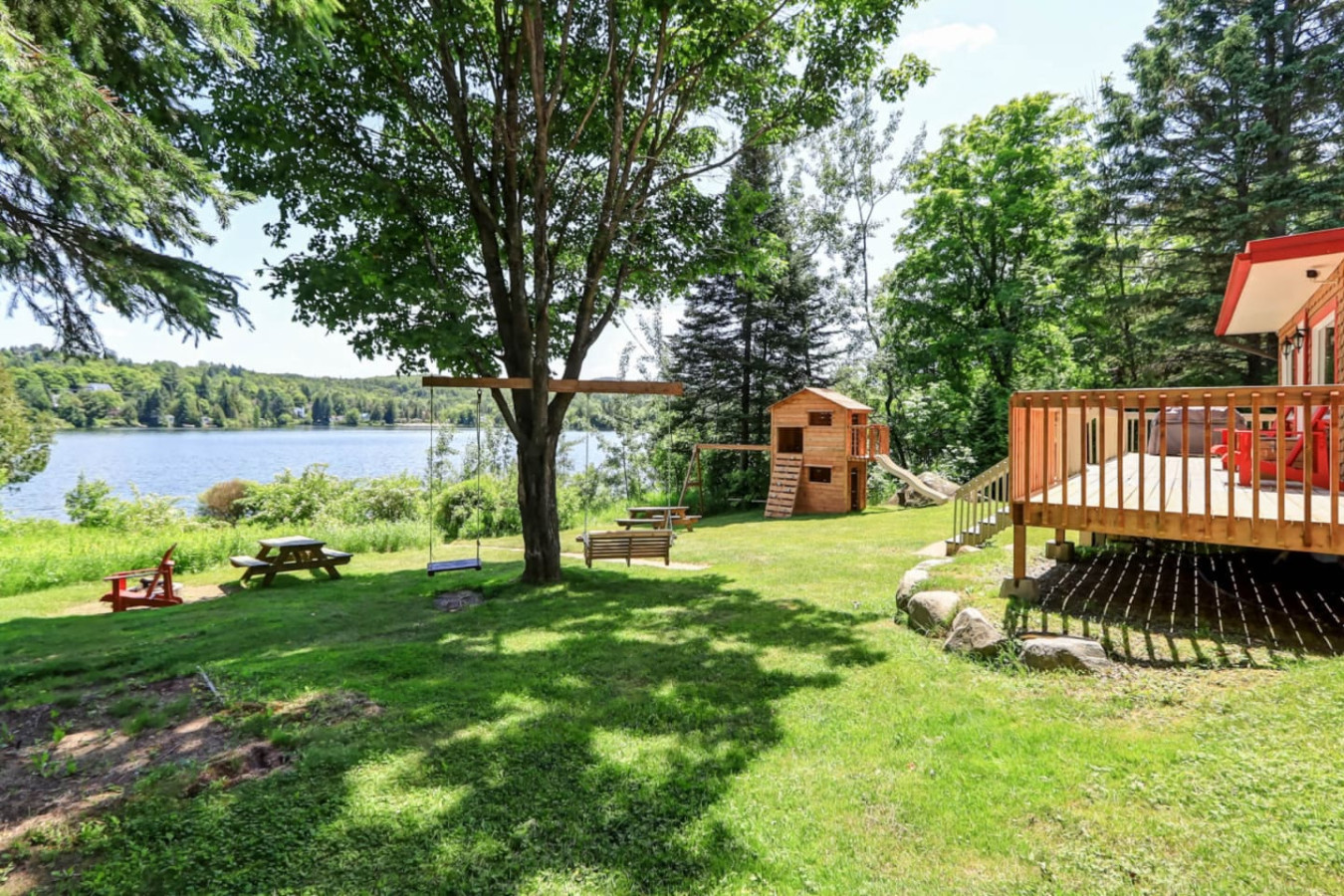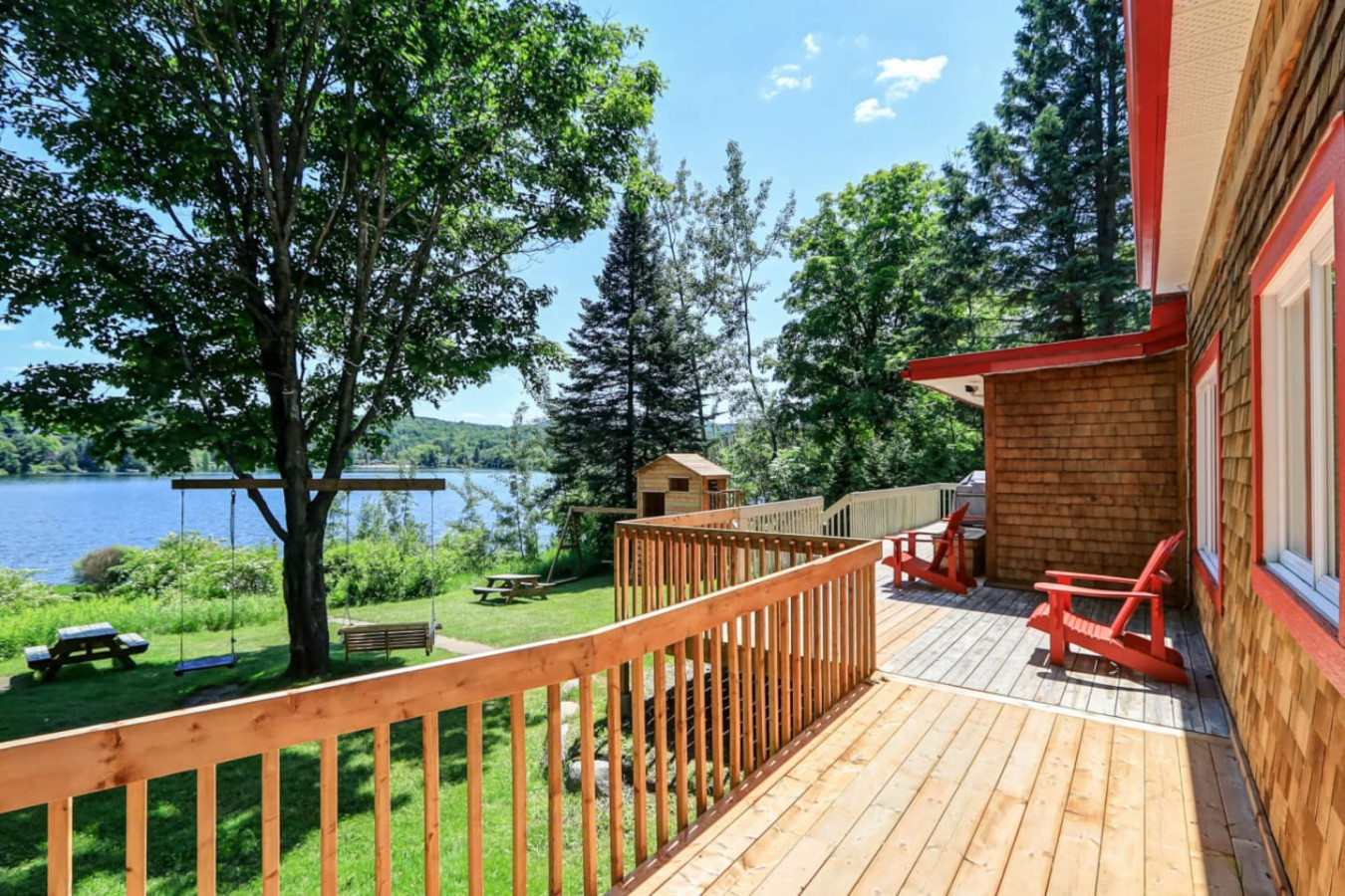 Chalet Familial situés dans un secteur calme et paisible avec parc pour enfants et balançoire. Grande terrasse pour relaxer et admirer la vue en nature.